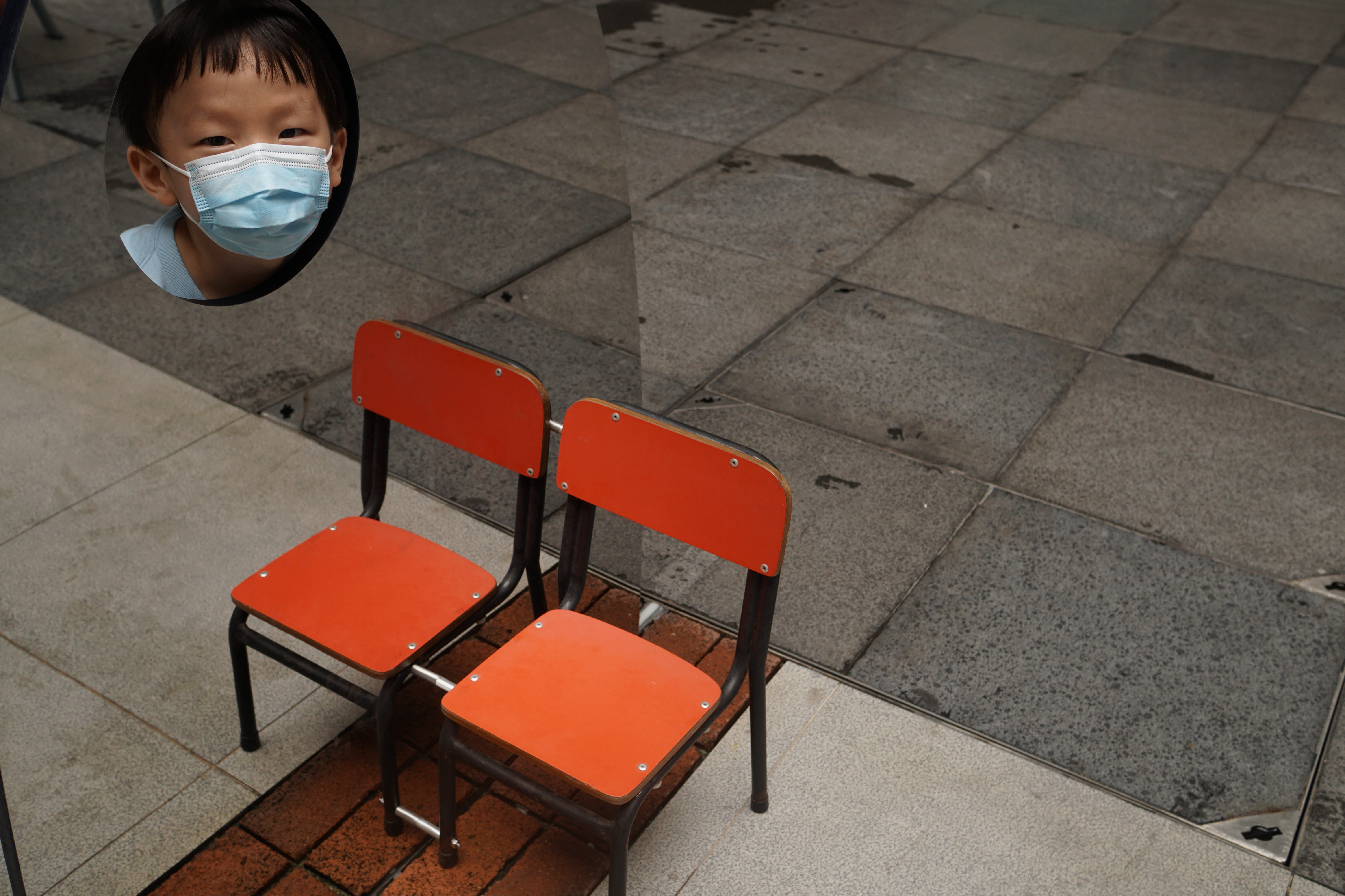 兩張從灣仔居民收集回來的學生椅子,一式一樣的就像是兩個雙生兒。在兩張椅子之間,裝置一塊半圓形鏡片,兩人分別坐在鏡的各一方。當兩個人偶發同步站起來,在那決定性的一瞬間,他們就像一對雙生兒。作品是一個公共傢私,同時是玩樂遊戲。